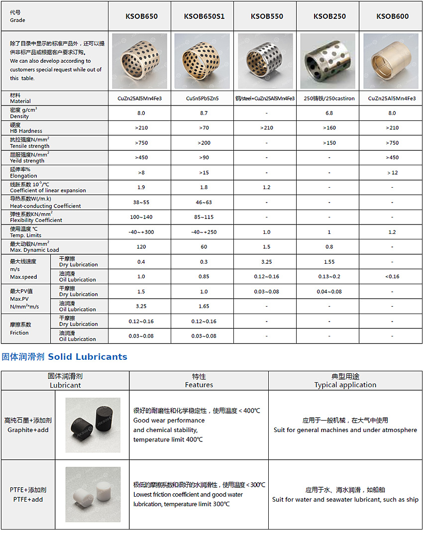 KSOB solid self-lubricating bearing materials consist of high strength metal with solid lubricants embedded, the metal hashigh load capacity and solid lubricants provided low friction during the operation, this construction reduces maintenance costfor both bearing and machinery. Based on the above technique theory, we developed KSOB550 steel shell cast bronze withgraphite plug bearings for economic and impact load application,KSOB250 steel with graphite plug bearings and KSOB850dispersed solid lubrication bearings for lower friction applications.