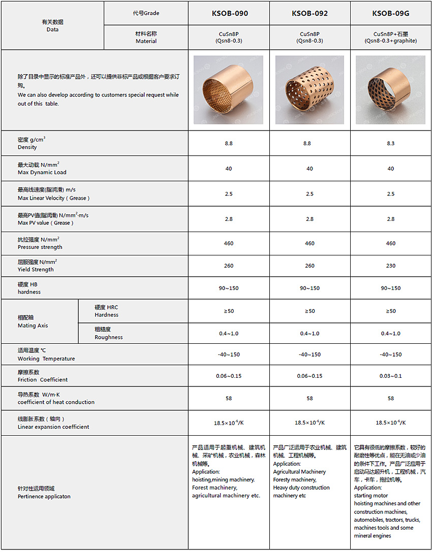 結(jié)構(gòu)特性 以CuSn8 青銅作為基板卷制而成的一種具有高承載、高耐磨的經(jīng)濟(jì)型薄壁銅基卷制軸承。根據(jù)不同的潤滑條件,我們可以提供菱形油穴和油孔兩種形式,菱形油穴用于油脂的潤滑,通孔用于流體潤滑,這樣的設(shè)計(jì)可以確保在軸承運(yùn)行初期就能建立潤滑油膜,因此可以降低起始摩擦系數(shù)。 產(chǎn)品應(yīng)用 農(nóng)用機(jī)械、建筑機(jī)械、起重機(jī)、卡車底盤部件、輸送機(jī)、升降機(jī)、卷揚(yáng)機(jī)、校平機(jī)等。 實(shí)際運(yùn)用中根據(jù)使用工況的不同,基體可以采用不同牌號的合金,表面可以加工成其他形式的油孔和油槽。產(chǎn)品范圍包括:KSOB-090、KSOB-092、KSOB-09G。